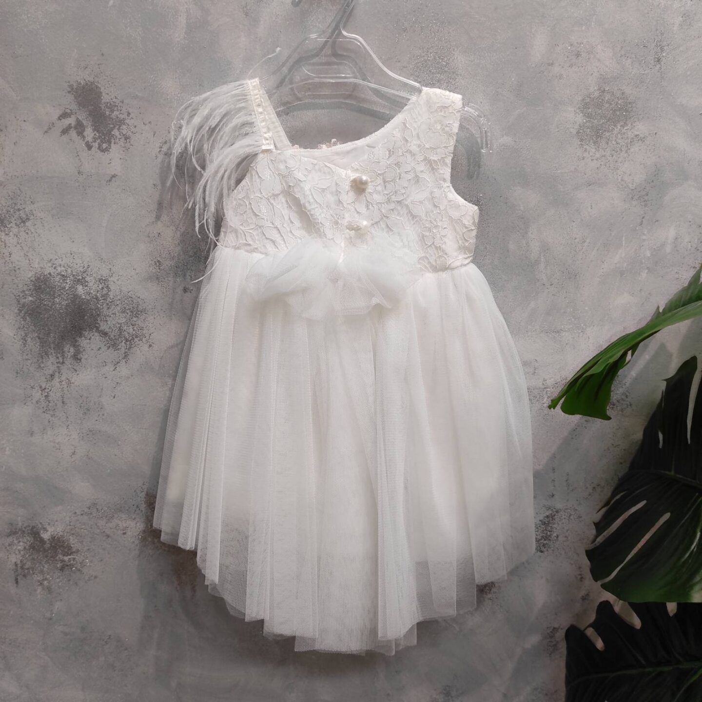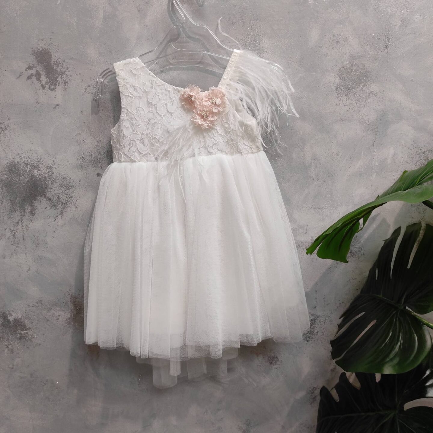 Boho βαπτιστικό φόρεμα με τούλι και δαντέλα. Το φόρεμα στον έναν ώμο διαθέτει φτερά. Καλύπτει εως 24 μηνών.