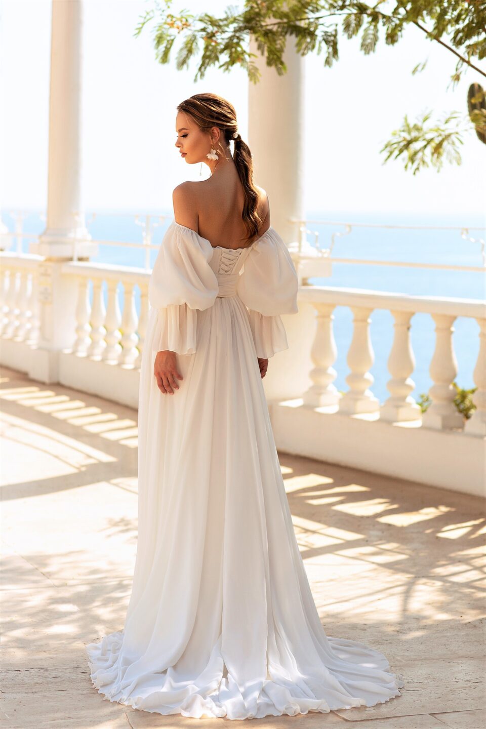 Boho μεταξωτό νυφικό με υπέροχα μανίκια και πλούσια ζώνη. Στράπλες μπούστο με cups και μακρύ μανίκι balloon με ανοιχτούς ώμους, μια ιδιαίτερη λεπτομέρεια που το κάνει να διαφέρει. Ψιλόμεση φούστα σε Άλφα γραμμή με ουρά. Κανονική εφαρμογή