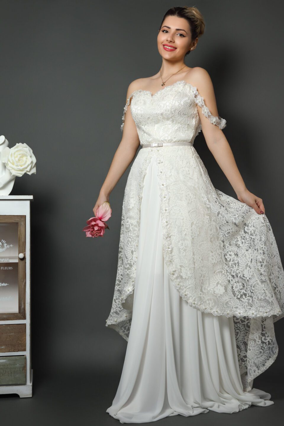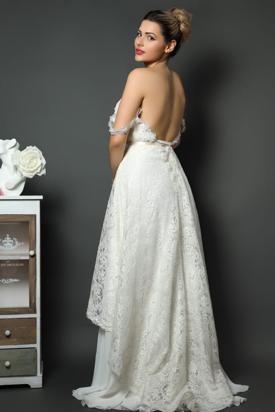 Boho νυφικό φόρεμα με γαλλική δαντέλα και μεταξωτή μουσελίονα εσωτερικά. Ασύμμετρη δαντέλα, υπέροχη ανοιχτή πλάτη και μπούστο καρδιά. Κανονική εφαρμογή
