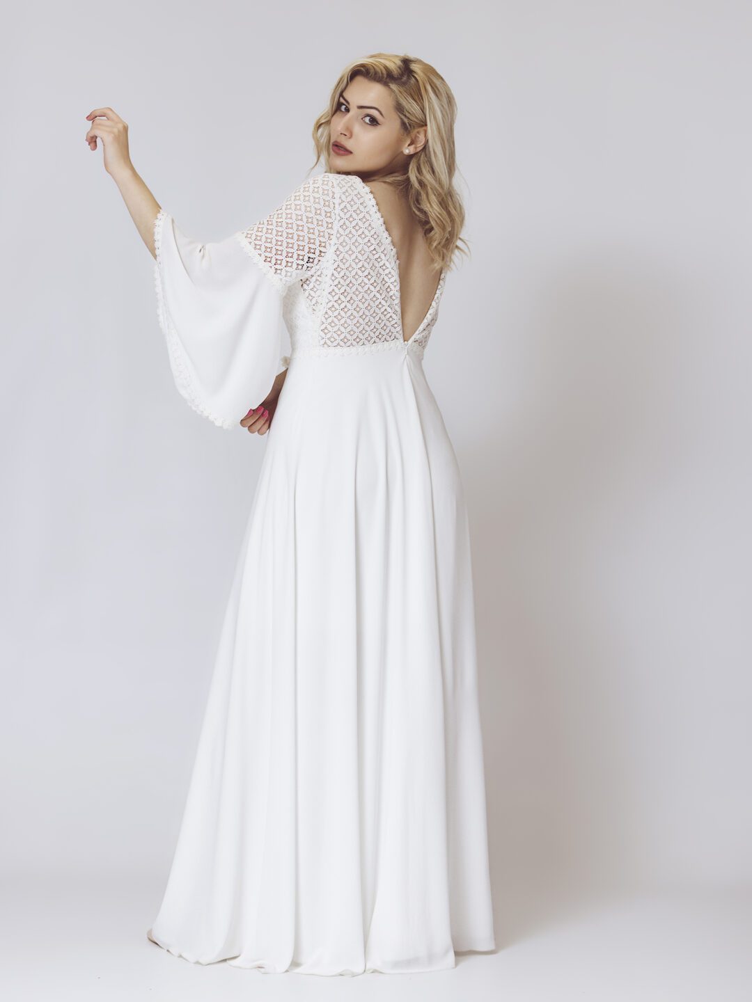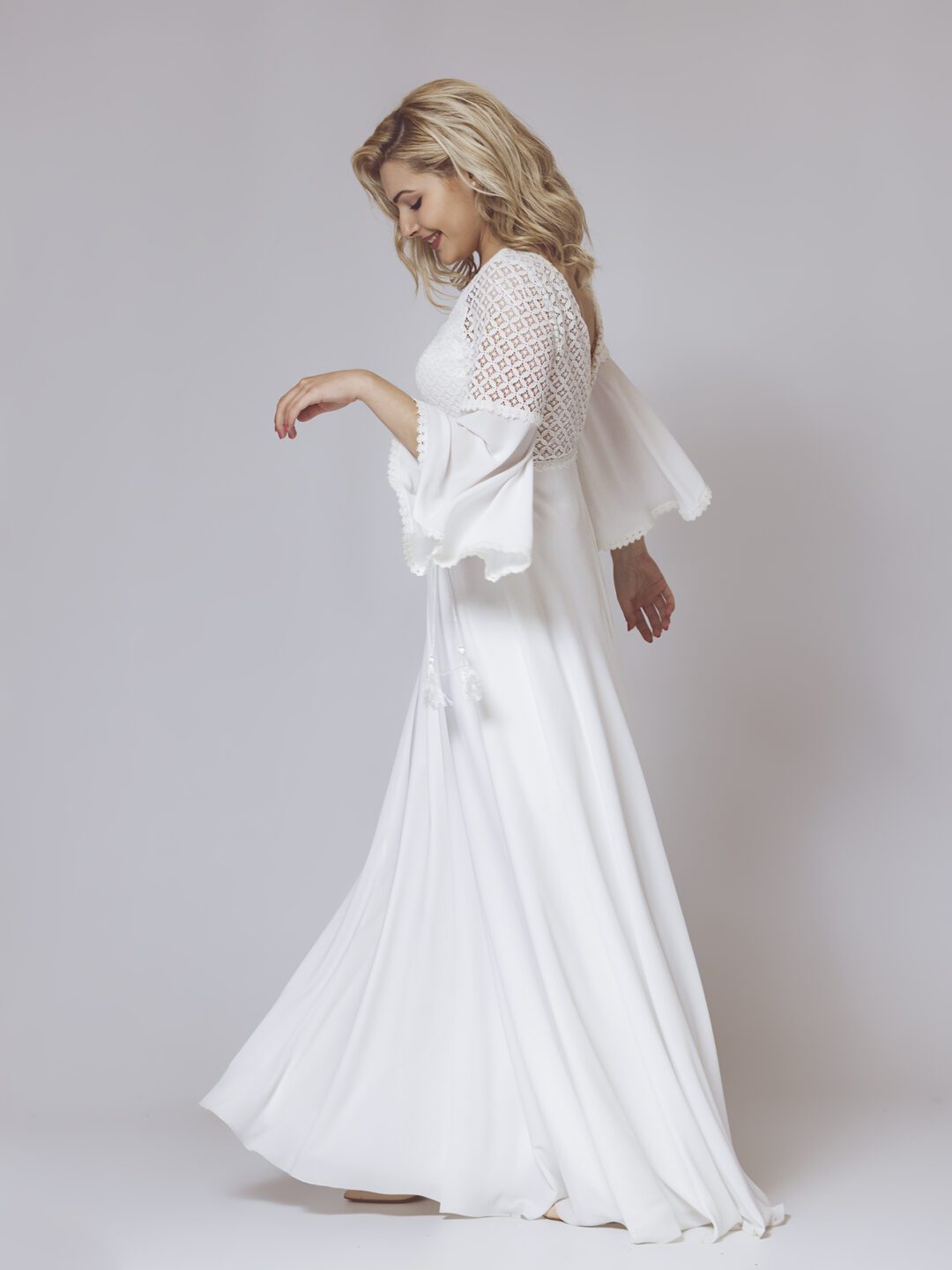 Boho chic νυφικό φόρεμα σε κρεπ, με ανάγλυφη βαμβακερή δαντέλα στο μπούστο, την πλάτη και το μανίκι. Υπέροχη πλάτη με διαφανή δαντέλα και άνοιγμα V. Σε άλφα γραμμή, ψιλόμεσο και με αέρινο μανίκι. Κανονική εφαρμογή. Ιδανικό για πολιτικό γάμο αλλά και σε εκκλησία! Το μοντέλο φοράει Medium. Ελληνικής ραφής