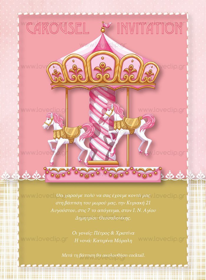 Επίλεξε για τη βάπτιση θέμα το Carousel. Διάλεξε το είδος προσκλητηρίου εδώ, την μπομπονιέρα εδώ και το πλήρες σετ βάπτισης εδώ, βάλτα στο καλάθι αγορών σου μαζί με αυτό το θέμα και εμείς θα εφαρμόσουμε το θέμα παντού! Το εικαστικό μπορεί να εφαρμοστεί ως προσκλητήριο στα παρακάτω προϊόντα: Ρολάκι με tag για τον παραλήπτη (small: 12Χ17εκ – large: 15Χ21εκ), Μονόκαρτο με χρωματιστό φάκελο επιλογής (small: 12Χ17εκ – large: 15Χ21εκ), Παζλ 12 τμχ με εκτυπωμένο κουτί (puzzle: 12Χ17εκ – box: 12Χ12X4εκ), Ξύλινο καδράκι με κάλεσμα σε ρολάκι (τετράγωνο: 12,5×12,5εκ – στρογγυλό: Φ12εκ).