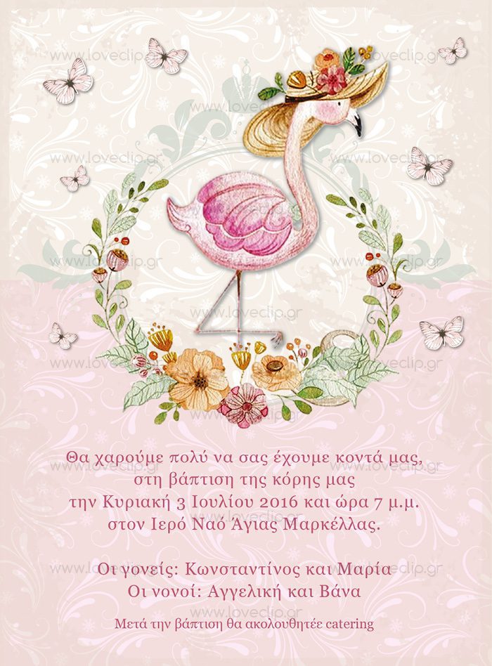 Επίλεξε για τη βάπτιση θέμα το Flamingo. Διάλεξε το είδος προσκλητηρίου εδώ, την μπομπονιέρα εδώ και το πλήρες σετ βάπτισης εδώ, βάλτα στο καλάθι αγορών σου μαζί με αυτό το θέμα και εμείς θα εφαρμόσουμε το θέμα παντού! Το εικαστικό μπορεί να εφαρμοστεί ως προσκλητήριο στα παρακάτω προϊόντα: Ρολάκι με tag για τον παραλήπτη (small: 12Χ17εκ – large: 15Χ21εκ), Μονόκαρτο με χρωματιστό φάκελο επιλογής (small: 12Χ17εκ – large: 15Χ21εκ), Παζλ 12 τμχ με εκτυπωμένο κουτί (puzzle: 12Χ17εκ – box: 12Χ12X4εκ), Ξύλινο καδράκι με κάλεσμα σε ρολάκι (τετράγωνο: 12,5×12,5εκ – στρογγυλό: Φ12εκ).