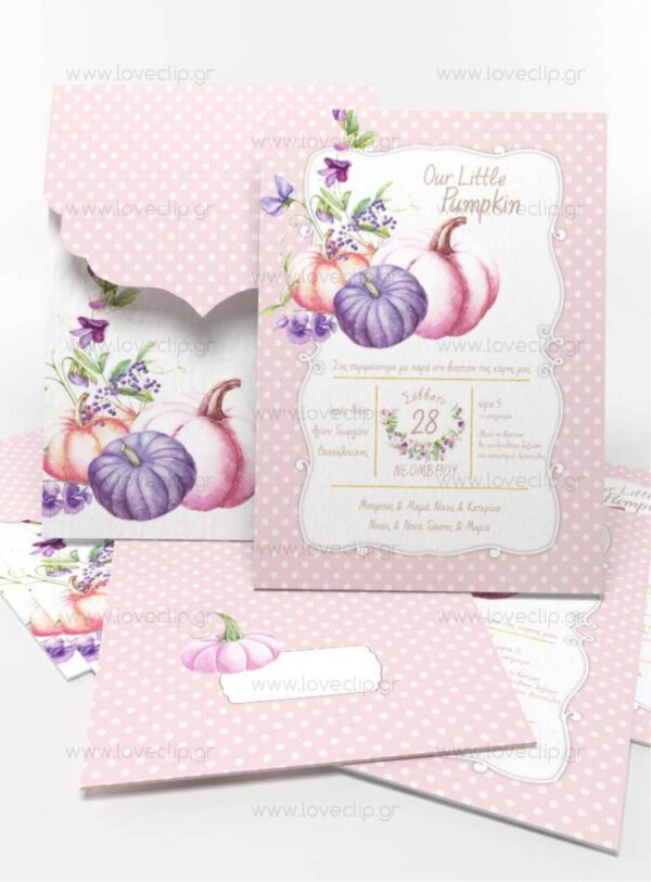 Επίλεξε τη βάπτιση με  θέμα την κολοκύθα μέρος ενός ρομαντικού παραμυθιού. Διάλεξε το μοτίβο, το είδος προσκλητηρίου εδώ, την μπομπονιέρα εδώ και το πλήρες σετ βάπτισης  εδώ, βάλτα στο καλάθι αγορών σου μαζί με αυτό το θέμα και εμείς θα εφαρμόσουμε το θέμα παντού!