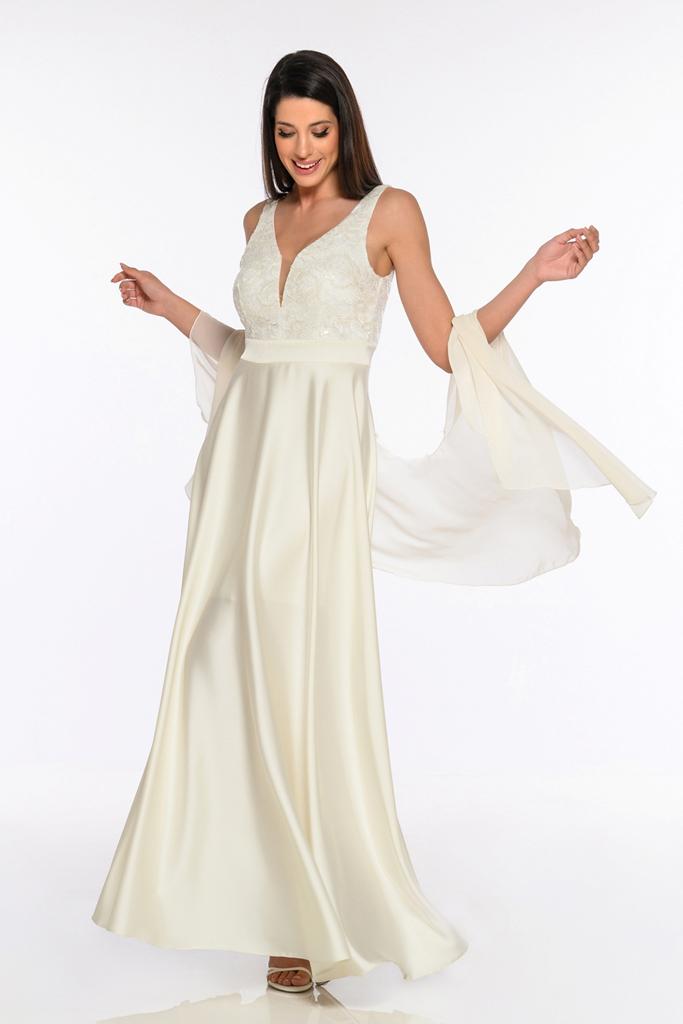 Maxi σατέν φόρεμα και δαντέλα. Στο επάνω μέρος διαθέτει δαντέλα. Έχει δική του εσάρπα