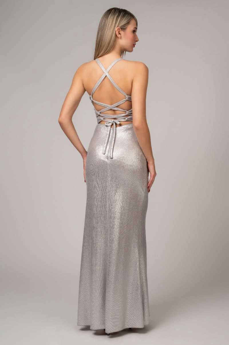 Maxi φόρεμα μεταλιζέ με σκίσιμο στο πλάι και πλάτη χιαστί.