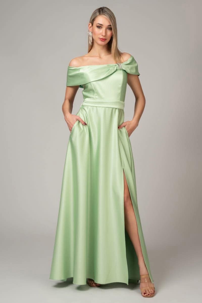 Maxi φόρεμα με ανοιχτούς ώμους και σκίσιμο μπροστά .