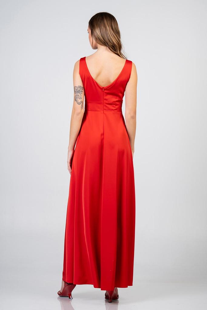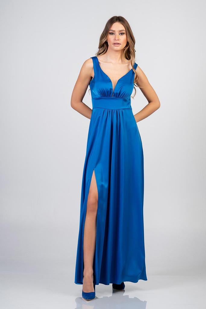 Maxi φόρεμα σατέν με σκίσιμο. Κάνει V μπροστά και στην πλάτη και έχει ένα μεγάλο σκίσιμο