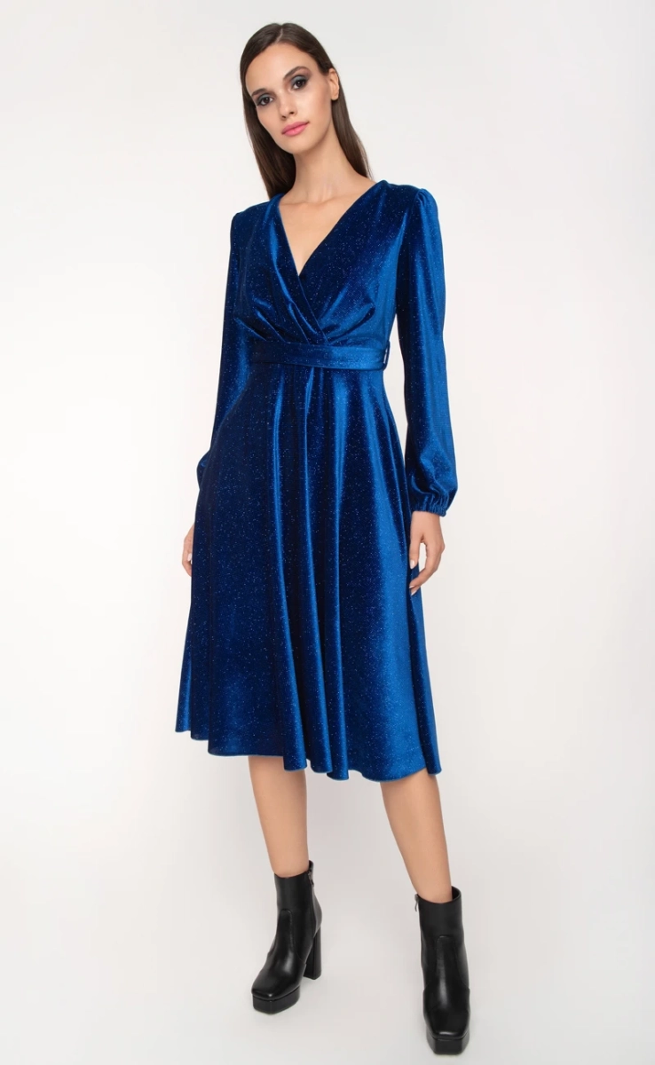 Midi φόρεμα με glitter σε μπλε. Το φόρεμα διαθέτει ol;oklhro διακριτικό glitter και είναι βελούδινο. Έχει δική του ενσωματωμένη ζώνη
