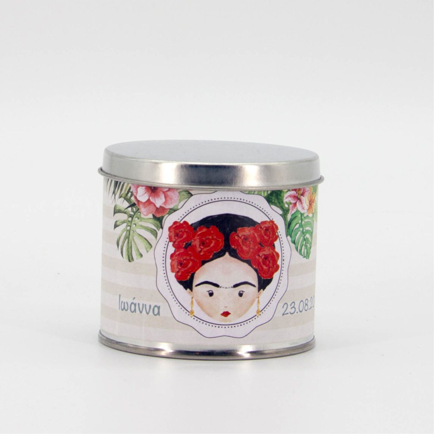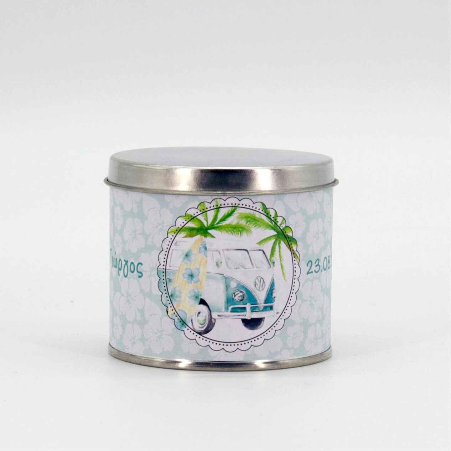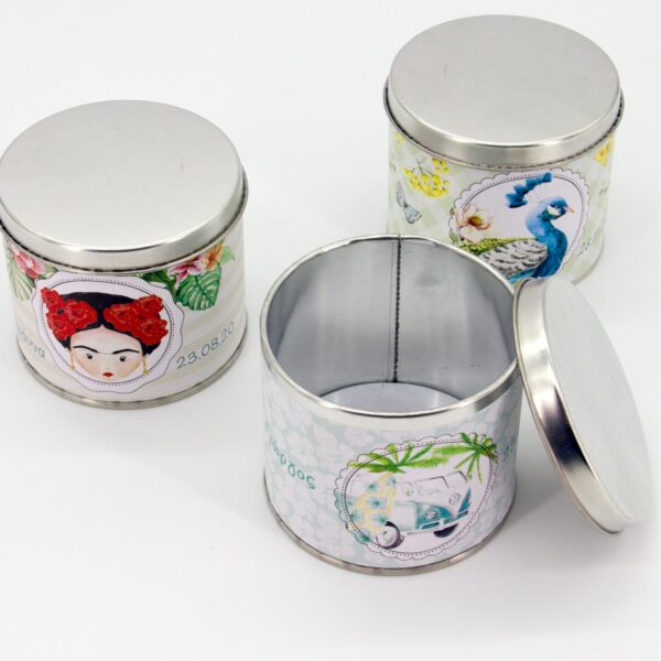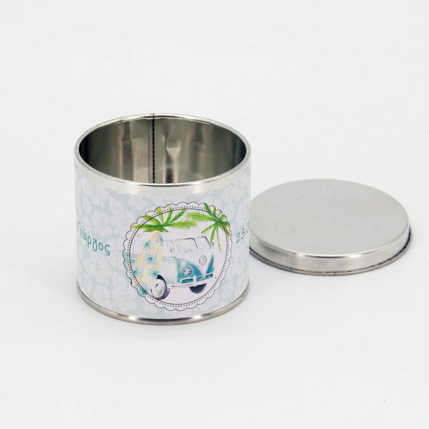Κυλινδρικό μεταλλικό κουτί µε απλό καπάκι διαμέτρου Φ7εκ και ύψους 7εκ. και περιμετρικό αυτοκόλλητο με 4χρωμη προσωποποιημένη εκτύπωση. Παραδίδεται ξεχωριστά (κουτί, καπάκι, αυτοκόλλητο) προς επεξεργασία, και στολισμό. Ελάχιστη παραγγελία 10 τεμάχια.