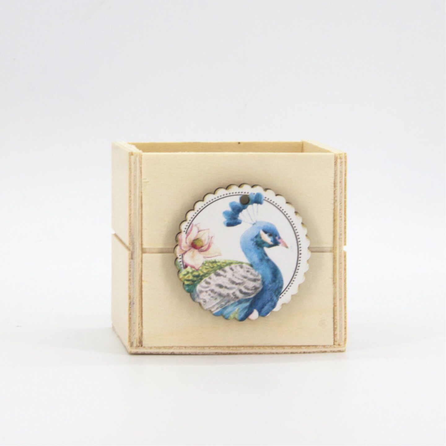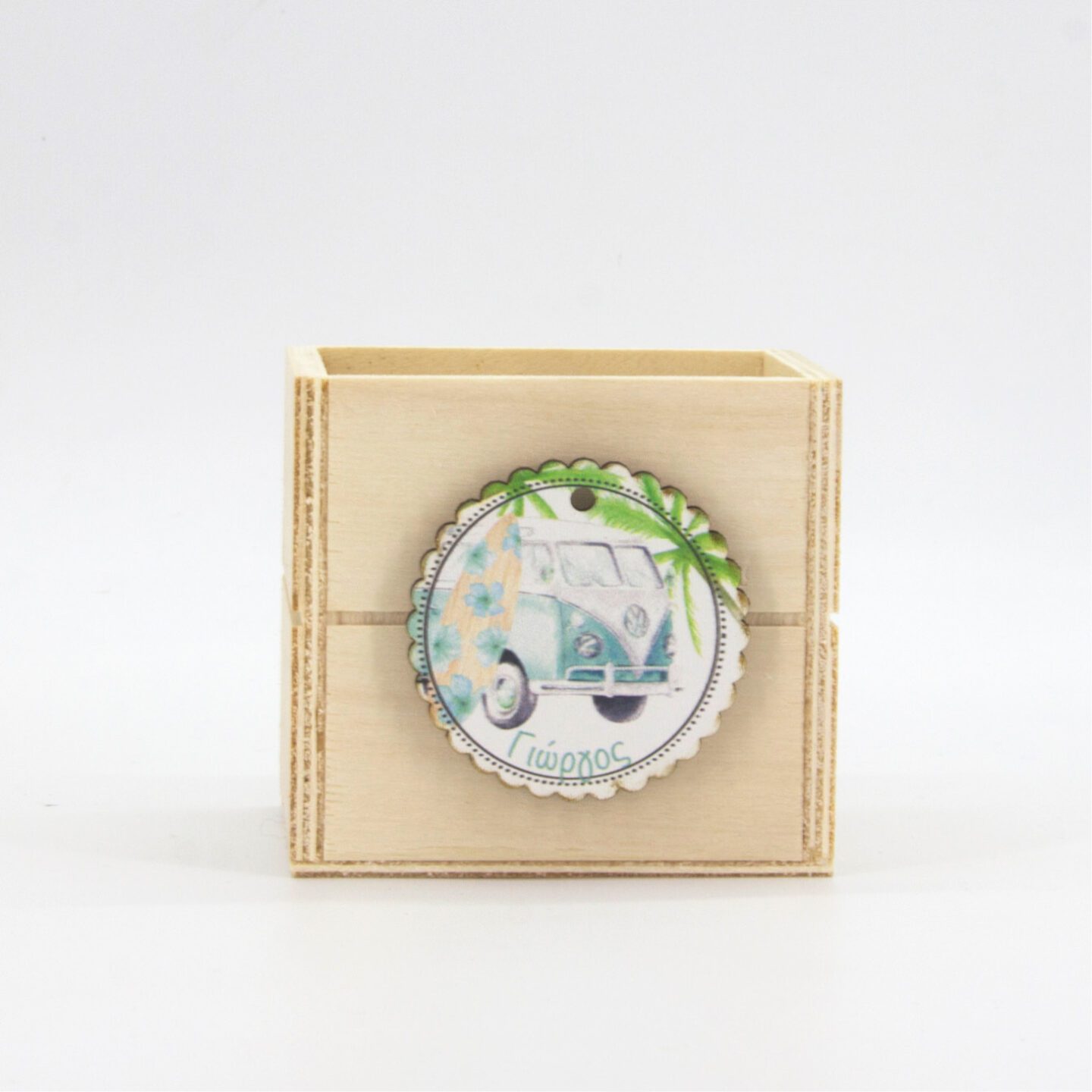Μπομπονιέρα βάπτισης ξύλινη μολυβοθήκη από σημύδα, διάστασης 9x9x9 εκ µε ξύλινο tag 5×7,5 εκ με τυπωμένο στο θέμα του μυστηρίου. Παραδίδεται ξεχωριστά (κουτί, tag) προς επεξεργασία, και στολισμό. Ελάχιστη παραγγελία 10 τεμάχια.