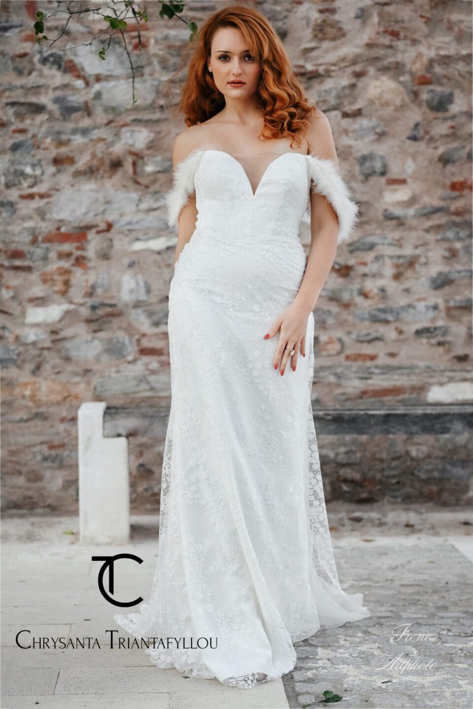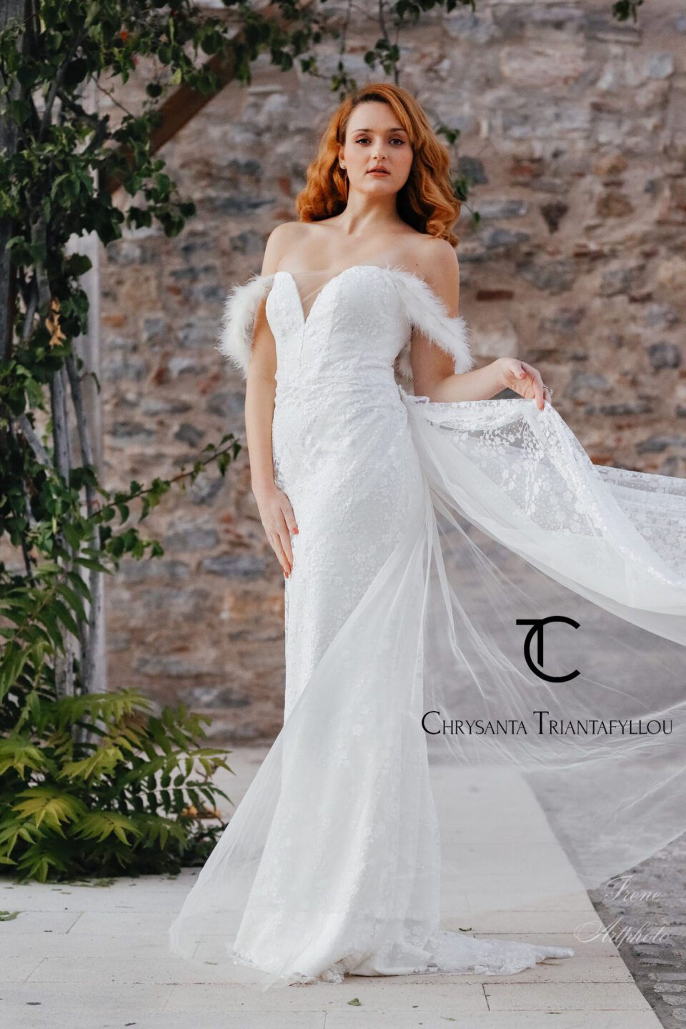 Nυφικό σε oλοκέντητη δαντέλα με πέρλα στην πιο elegance εκδοχή της, με λάμψη από γκλίτερ. Μπούστο καρδιά, με πούπουλα  ριχτά στον ώμο. Κανονική εφαρμογή.