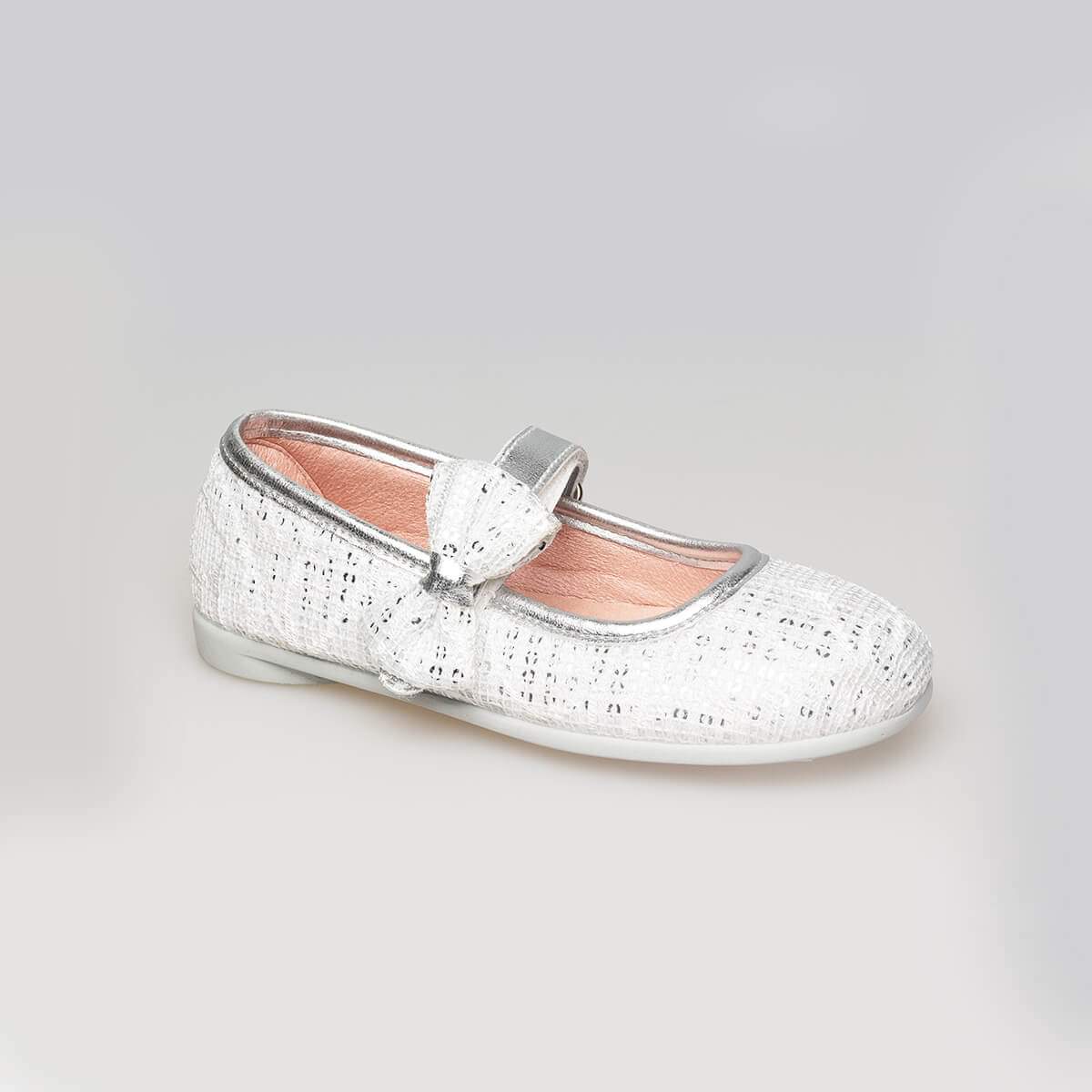 Παιδικό παπούτσι λευκή μπαρέτα με παγιέτες, διακοσμημένο με φιογκάκι και ασημί λουράκι. Όλο δέρμα από μέσα και ανατομικό πάτο με αφρό μνήμης για ξεκούραστο περπάτημα.