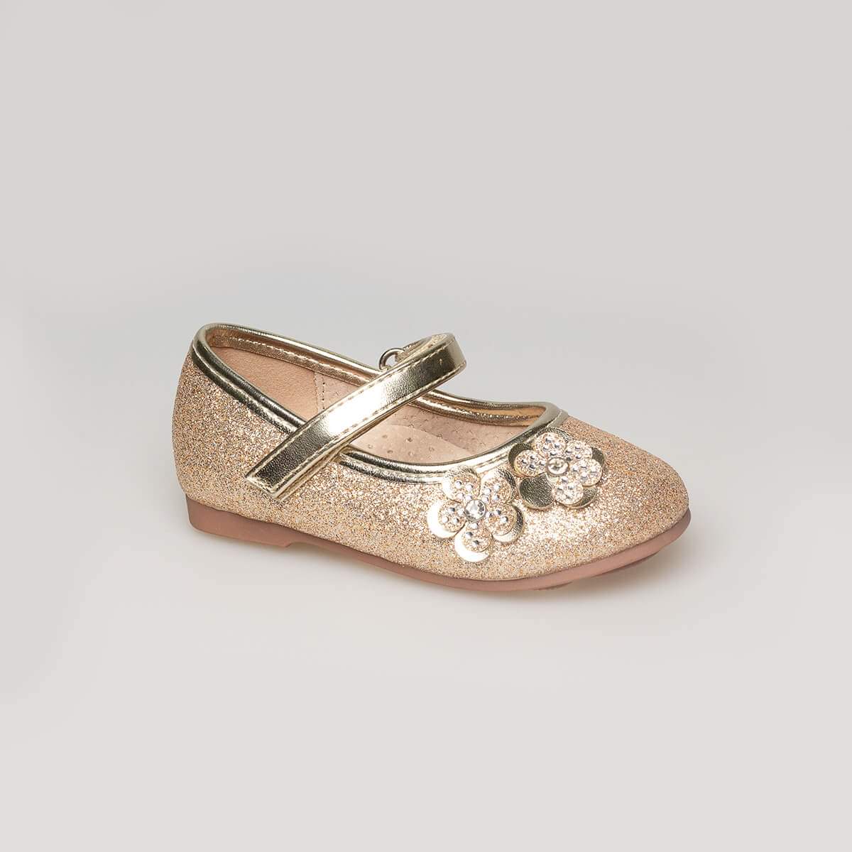 Παιδικό παπούτσι χρυσή μπαρέτα, διακοσμημένο με λουλουδάκια και λουράκι. Όλο δέρμα από μέσα και ανατομικό πάτο με αφρό μνήμης για ξεκούραστο περπάτημα.