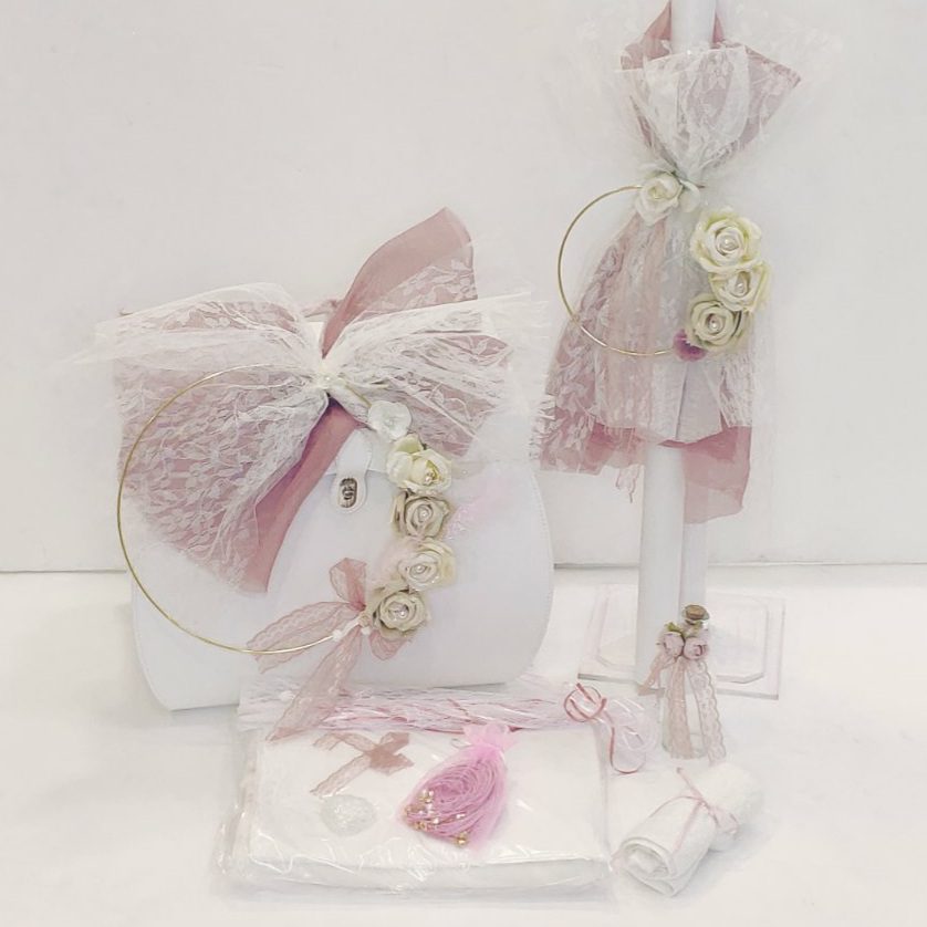 Πλήρες σετ βάπτισης με vintage θέμα διακοσμημένο με χειροποίητα υφασμάτικα λουλούδια και δαντέλες στα χώματα της αρεσκείας σας. Συνοδεύτε με δερμάτινη βαλίτσα. Το σετ περιλαμβάνει στολισμένη βαλίτσα, στολισμό λαμπάδας (δεν συμπεριλαμβάνεται το κερί), 50 μαρτυρικά, 3 κεράκια στολισμένα, μπουκαλάκι λαδιού, σαπουνάκια, πετσέτες, σετ λαδόπανα και εσώρουχα. Το σετ κουτί βάφτισης είναι χειροποίητο και χρειάζεται 10-12 μέρες παράδοσης.