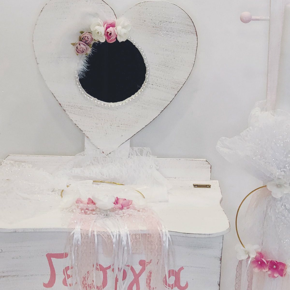Πλήρες σετ βάπτισης με vintage θέμα διακοσμημένο με χειροποίητα υφασμάτινα λουλούδια και δαντέλες στα χώματα της αρεσκείας σας. Συνοδεύτε με μπουντουάρ, καθρέφτη και σκαμπό. Το σετ περιλαμβάνει στολισμένο μπουντουάρ, στολισμό λαμπάδας (δεν συμπεριλαμβάνεται το κερί), 50 μαρτυρικά, 3 κεράκια στολισμένα, μπουκαλάκι λαδιού, σαπουνάκια, πετσέτες, σετ λαδόπανα και εσώρουχα. Το σετ κουτί βάφτισης είναι χειροποίητο και χρειάζεται 10-12 μέρες παράδοσης.
