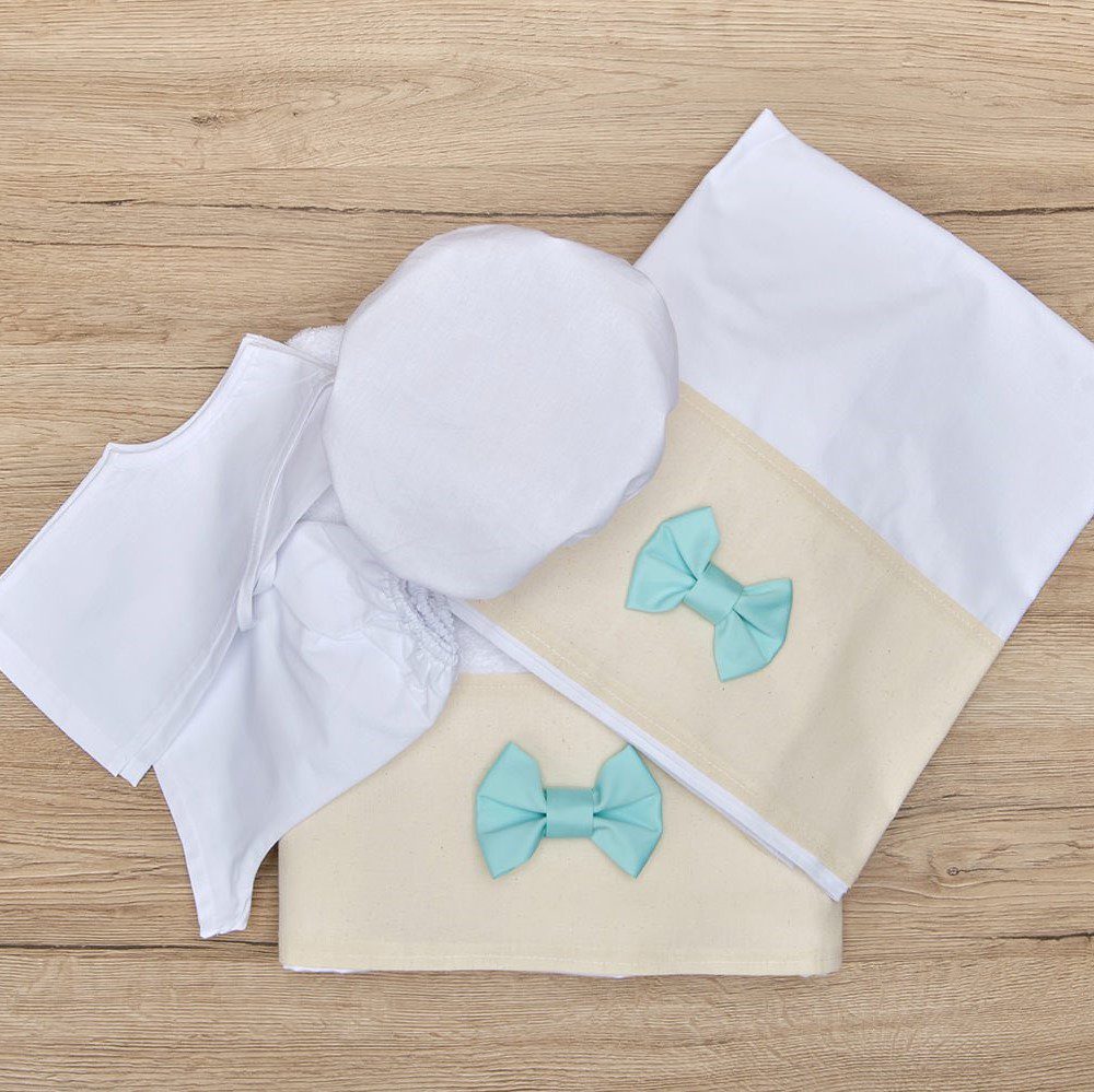 Σετ Λαδόπανα βάπτισης με μεγάλη πετσέτα, μεγάλο λαδόπανο που χρησιμοποιείτε για σεντόνι στο παιδικό κρεββάτι και εσώρουχα από λαδόπανο. Επιλέξτε το σχέδιο ανάλογα με τα χρώματα του βαπτιστικού σας ρούχου για ομοιόμορφο αποτέλεσμα! Διατίθεται σε 4 διαφορετικά χρώματα στον φιόγκο μέντα, μπεζ, navy blue και μπορντό. Γράψτε μας στα σχόλια το χρώμα. Είναι κατασκευασμένα στη Ελλάδα από εξαιρετικής ποιότητας βαμβάκι.